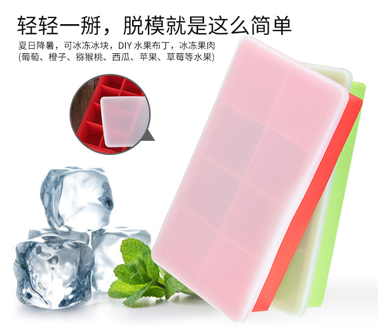 • 8格硅胶冰格,大块制冰,冰块制冷效果跟好,多种颜色可选,产品原料通过美国FDA认证,安全环保无毒,适用于酒吧、餐厅、家庭制作冰块、diy布丁、制作宝宝辅食盒等。